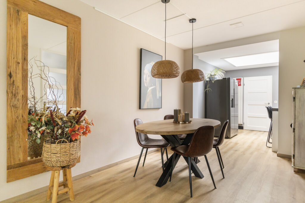 Via de entree/hal met toilet bereikt u de royale woonkamer met fraai vrij zicht op de voortuin, een gezellige gashaard, praktische trapkast en een airco voor extra comfort. Aan de achterzijde bevindt zich de uitgebouwde open keuken met vloerverwarming en inbouwapparatuur. Vanuit de keuken is de handige bijkeuken met achterentree bereikbaar.
