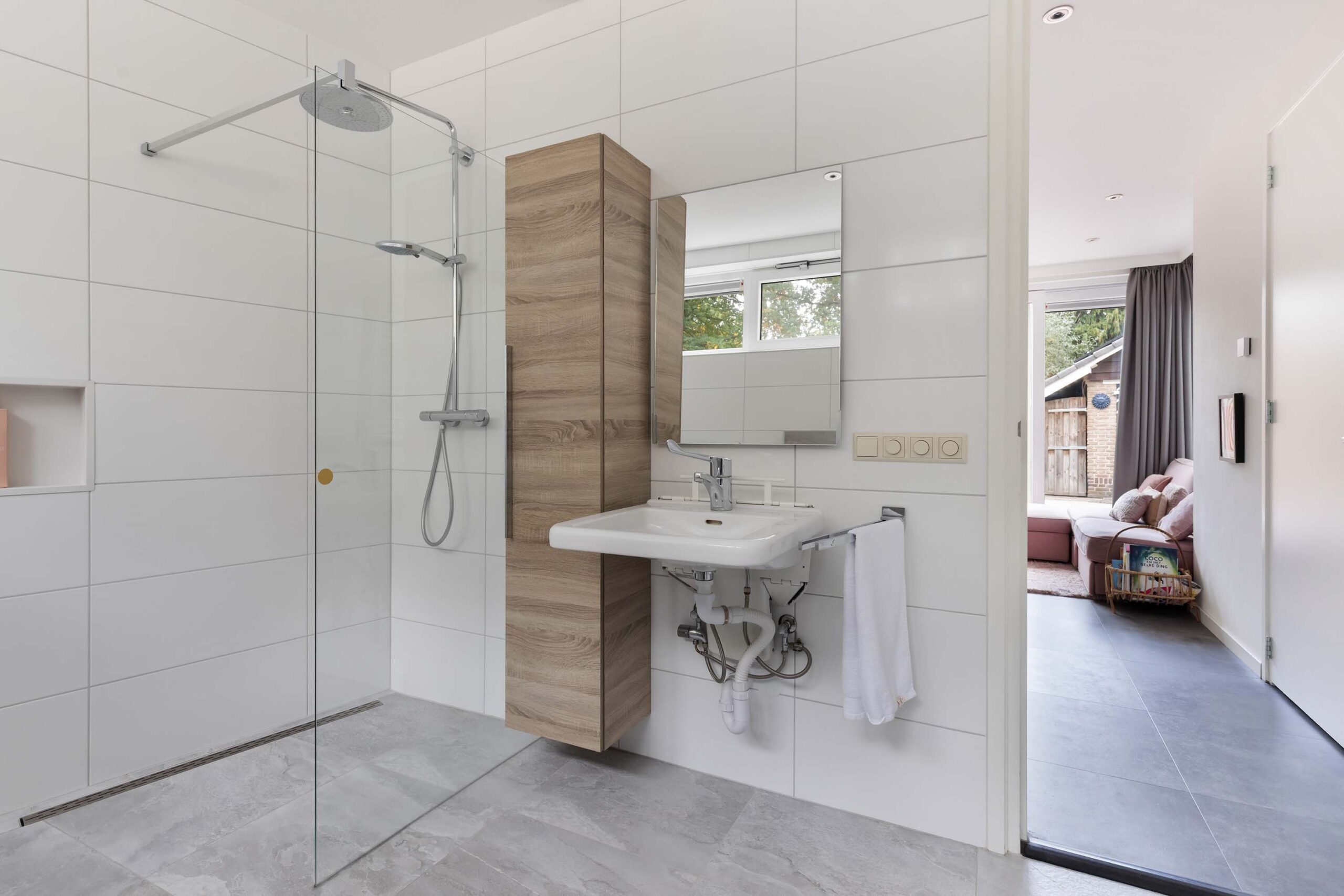 Entree, hal, meterkast, modern toilet met fonteintje en toegang tot de kelder. De ruime en lichte woonkamer beschikt over veel raampartijen, waardoor het een aangename en open sfeer heeft. De zijuitbouw is ingericht als slaapkamer met aangrenzende badkamer, compleet met douche, in hoogte verstelbare wastafel, bidet en tweede toilet – ideaal als levensloopbestendige of rolstoelvriendelijke oplossing. Aan de achterzijde bevindt zich de open keuken met diverse inbouwapparatuur en een deur naar de aangebouwde, afsluitbare overkapping: een fijne plek om het hele jaar door buiten te zitten.